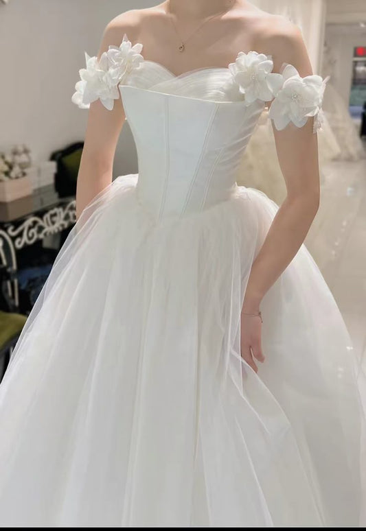 White Off Shoulder Wedding Dresses Tulle Floral Sleeveless Bridal Gown S7127