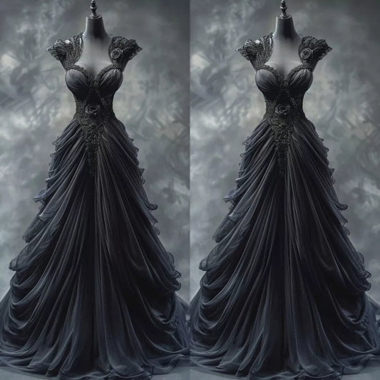 Black Gothic Wedding Dresses Ruched Lace Appliques V Neck Sleeveless Bridal Gown S7126