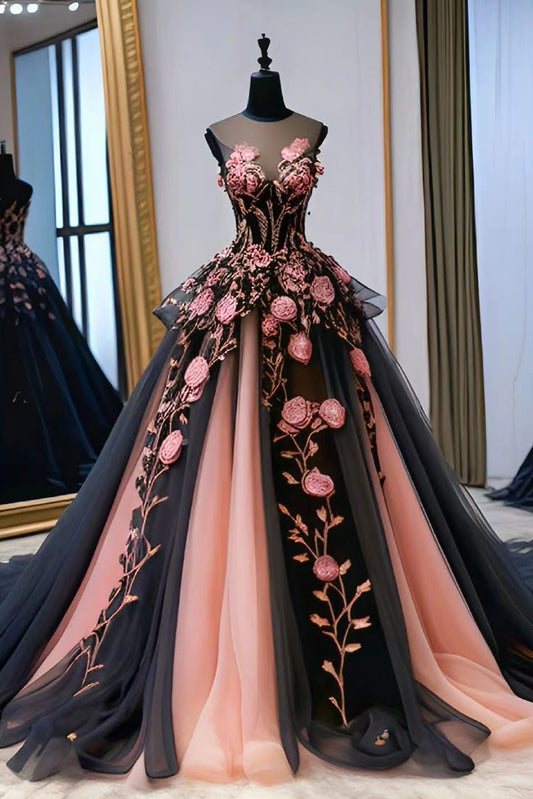 Vintage A-line tulle appliques long prom dress, formal evening dress S7135