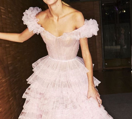 Princess A-Line Off the Shoulder Pink Tulle Prom Evening Dresses S7112