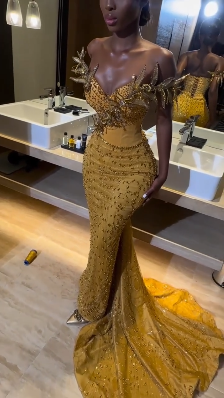 Gold Mermaid Off Shoulder Beaded Long Prom Dress Evening Formal Dress S7090