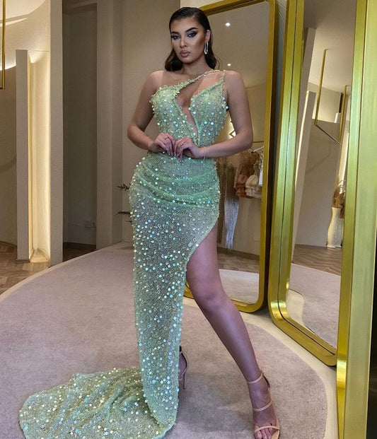 Long One Shoulder Evening Dresses for Women Beaded Sequin Dress Light Green Sexy Cocktail Dress S6222