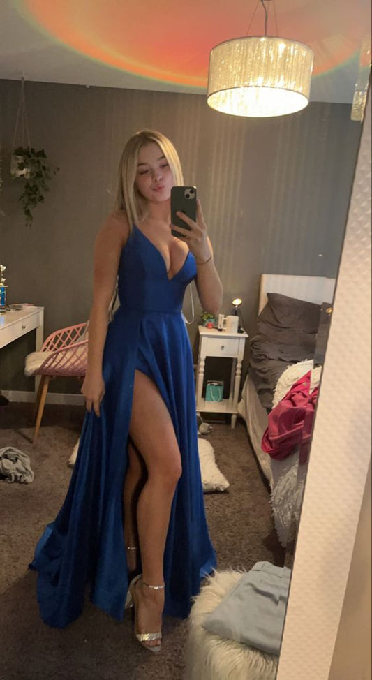 A-Line Spaghetti Straps V-Neck High Slit Party Prom Formal Evening Dress S5385