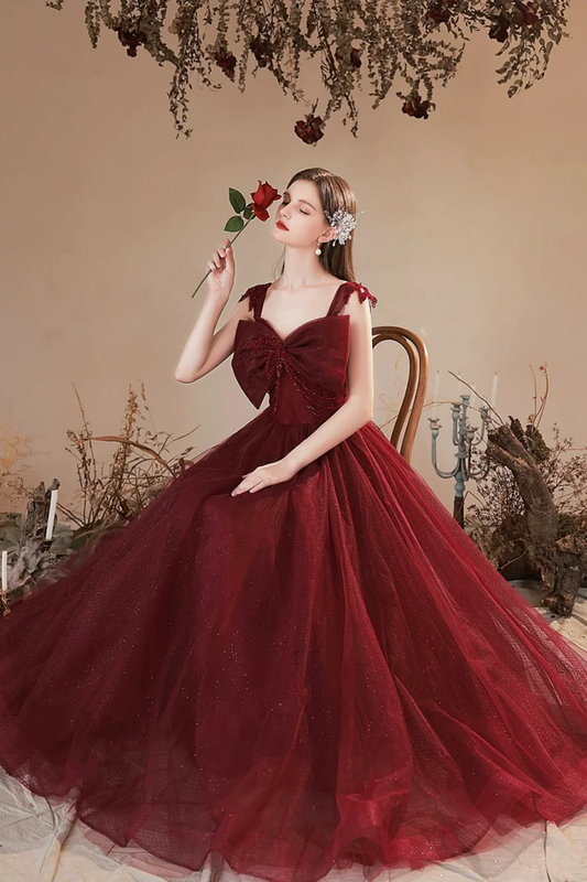 Burgundy Tulle A Line Long Prom Dresses with Bow, Long Burgundy Formal Graduation Evening Dresses S5386