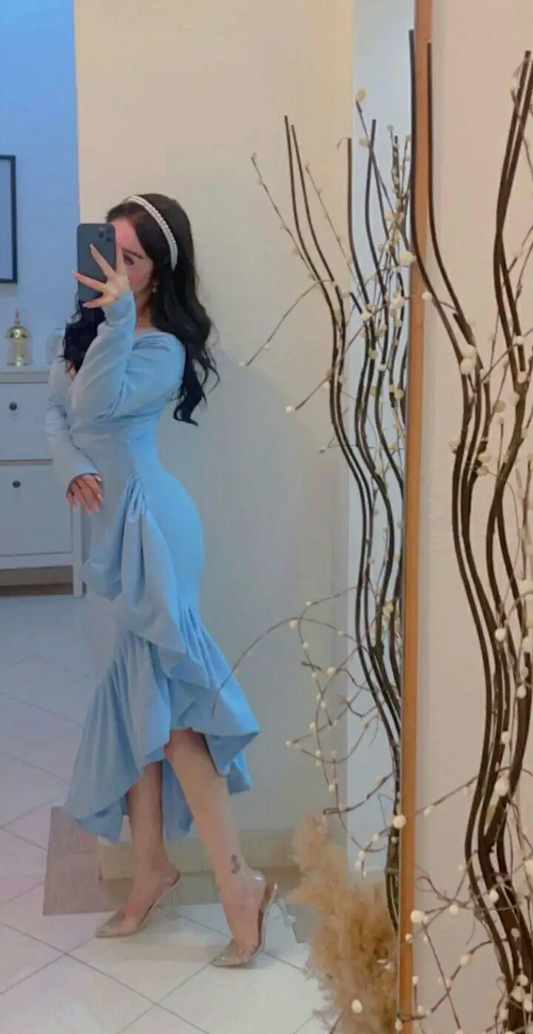 Mermaid Light Blue Women's Prom Dresses V Neck Long Sleeves Formal Occasion Dress Evening Dress S5380