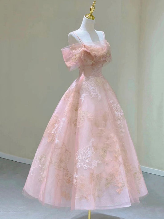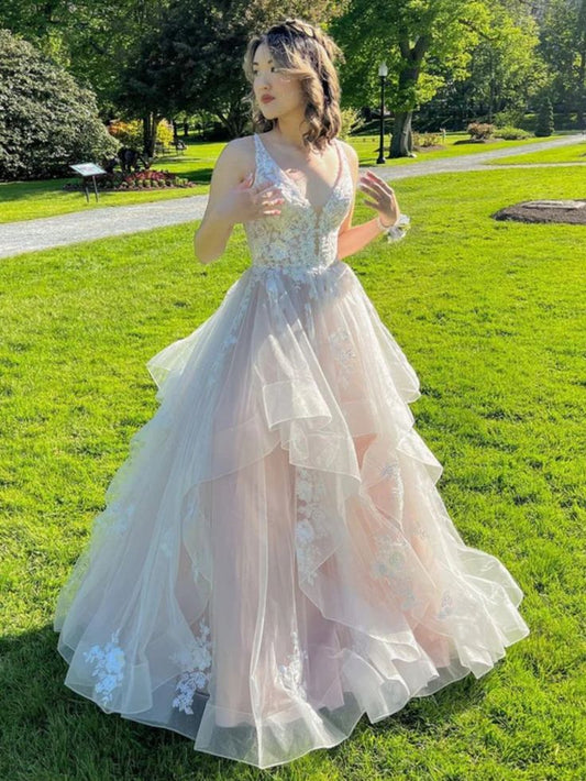 V Neck Light Pink Tulle A Line Prom Dress S5356