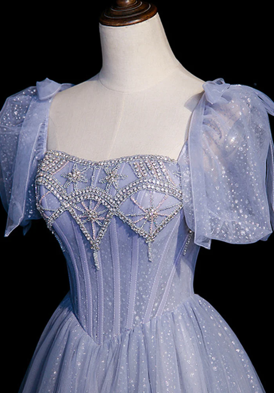 Blue tulle beaded long ball gown A-line formal gown S838