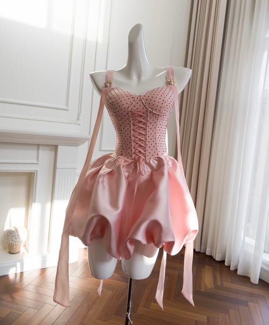 Pink cute suspender waist A-line short skirt homecoming dress R3398