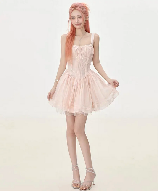 Light pink suspender waist slim A-line short skirt homecoming dress R5237