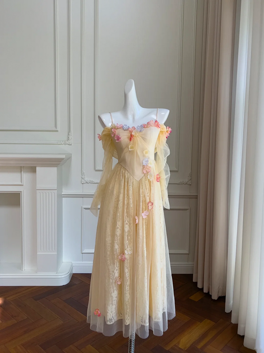 Light yellow suspender three-dimensional flower waist slimming elegant long skirt homecoming dress R5191