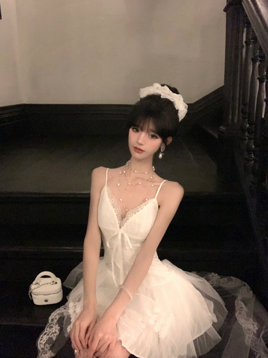 White suspender waist slim A-line short skirt homecoming dress R5053