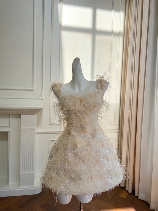 Pink suspender feather design waist slim A-line short skirt homecoming dress R5049