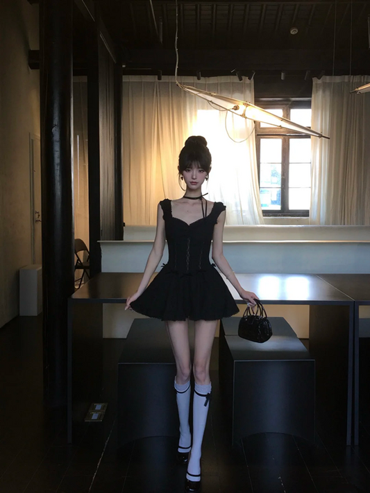 Black suspenders slim waist A-line cute short skirt homecoming dress R5061