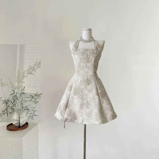 Retro halter neck waist slim fit brown A-line slim short skirt homecoming dress R4365