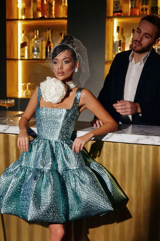 Green halter shoulder neckline white bud skirt short skirt homecoming dress R3718
