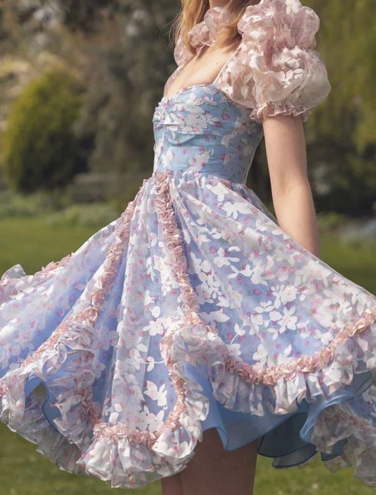 Powder blue puff sleeve waist A-line fantasy princess skirt homecoming dress R3690