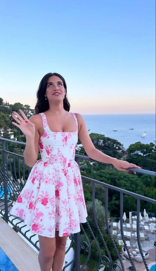 White background pink floral suspenders waist slim A-line short skirt homecoming dress R3691