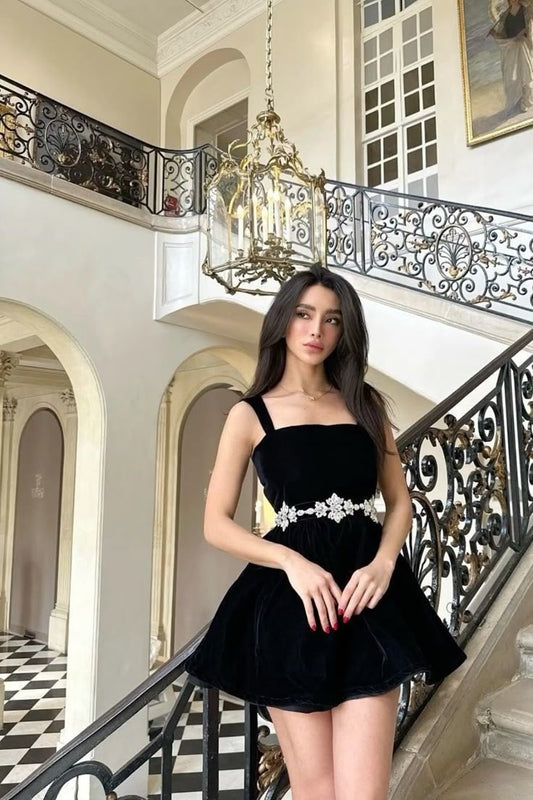 Black suspenders waist slim A-line short skirt homecoming dress R3683