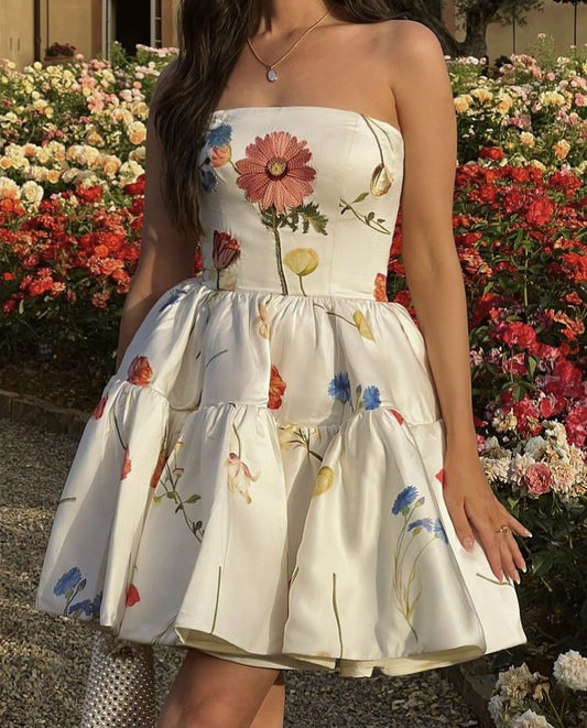 White tube top short skirt printed waist fresh puffy short skirt homecoming dress R3644