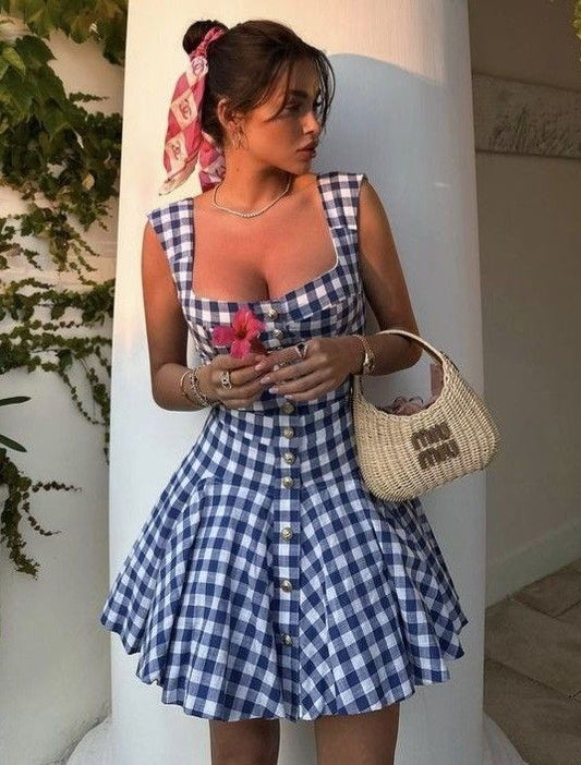 Blue and white checkered suspenders waist slim short skirt homecoming dress R3471