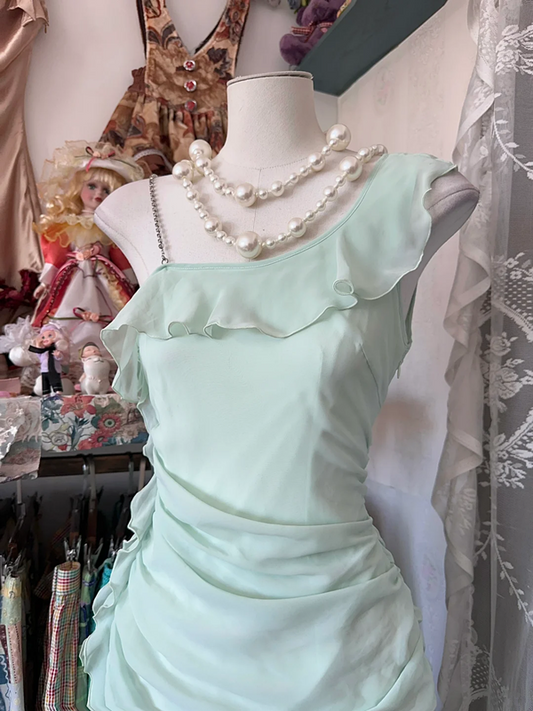 Light blue one-shoulder sexy ruffled maxi dress, ball gown R6345