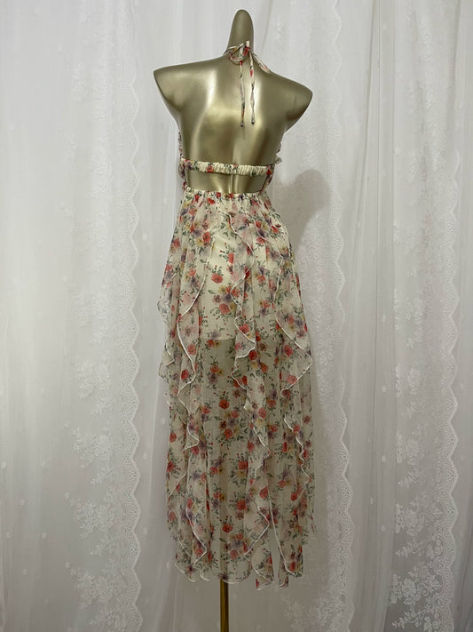 New arrival elegant ruffled halter neck floral slit backless midi dress holiday dress S5769
