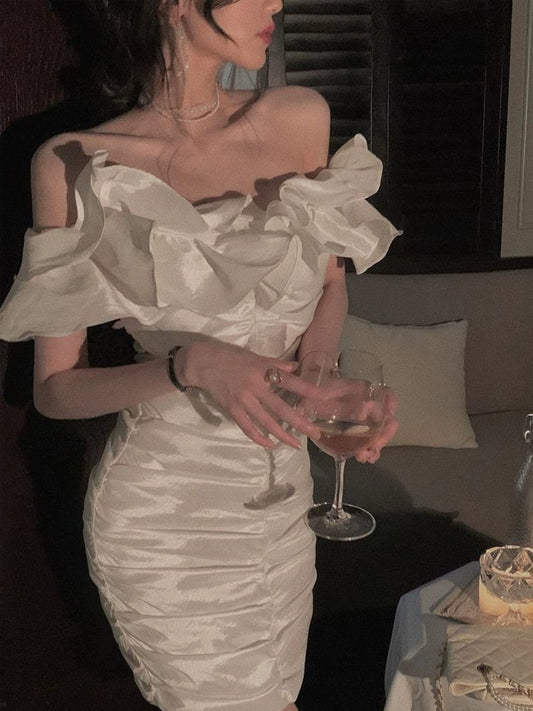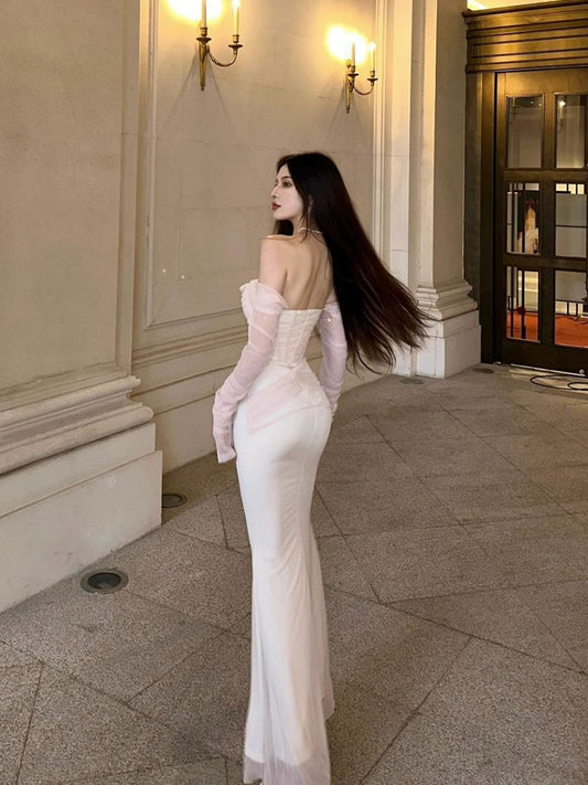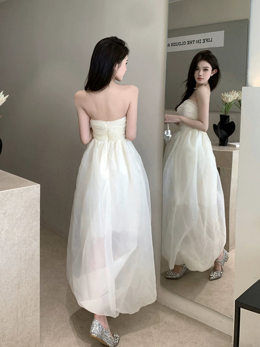 Engagement dress celebrity banquet white satin suspender dress S5774