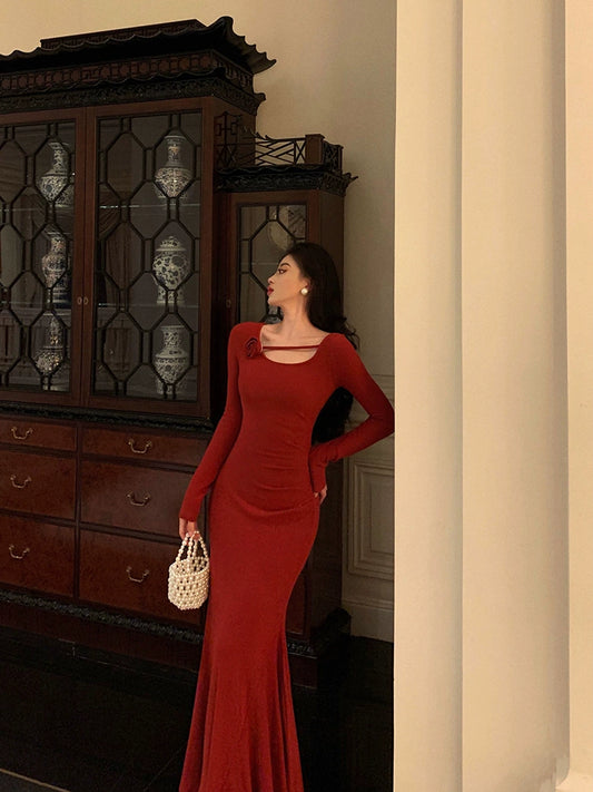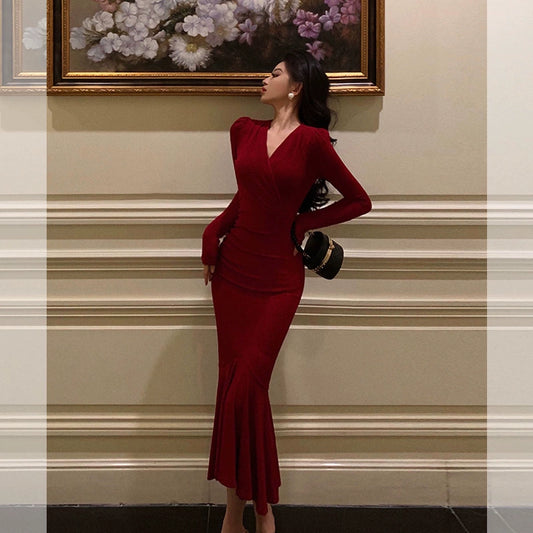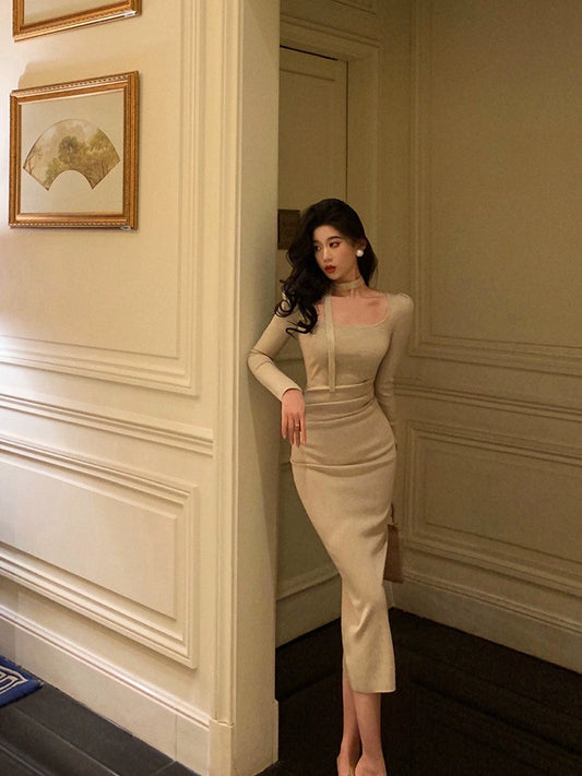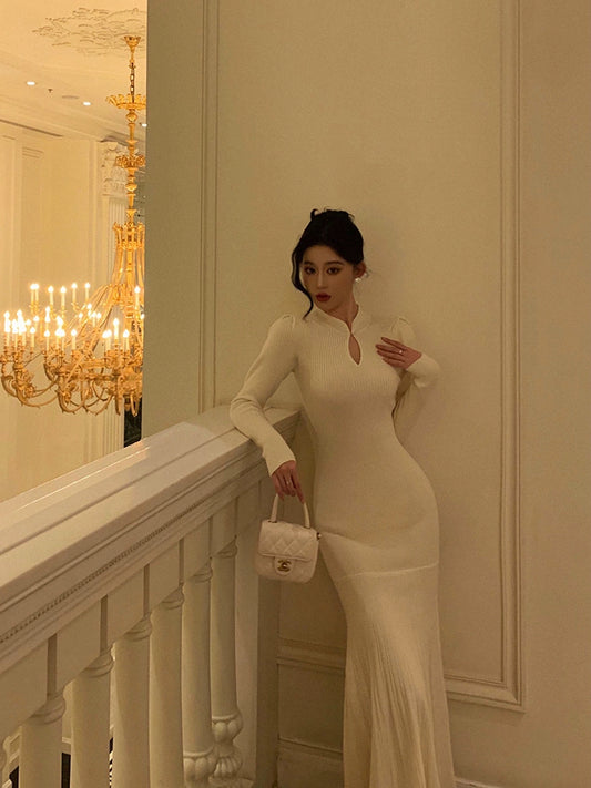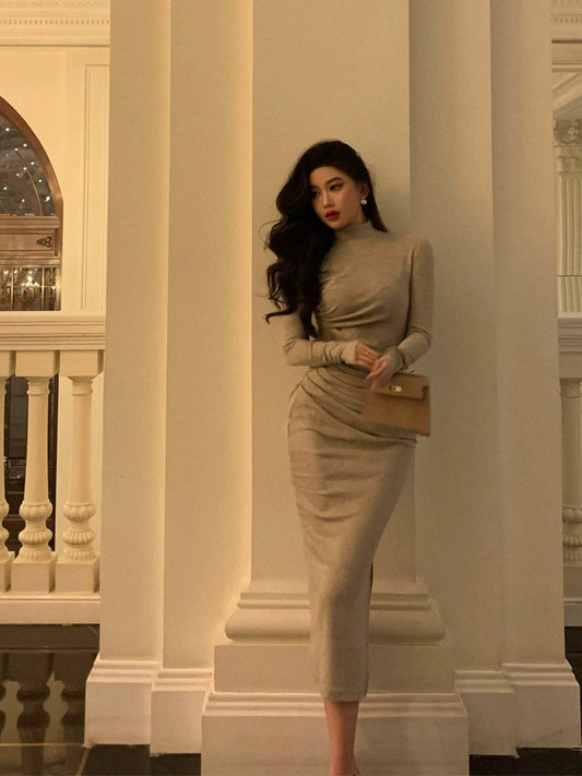 Gentle style long-sleeved knitted dress for women pleated party dress S5587