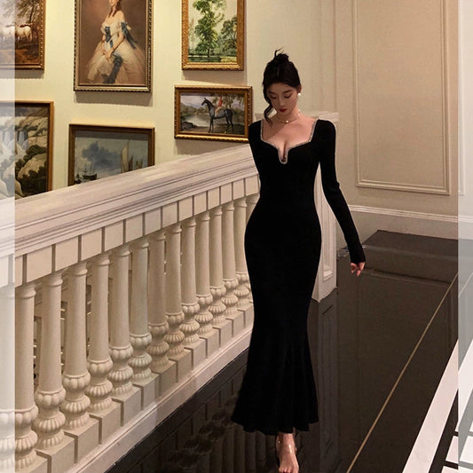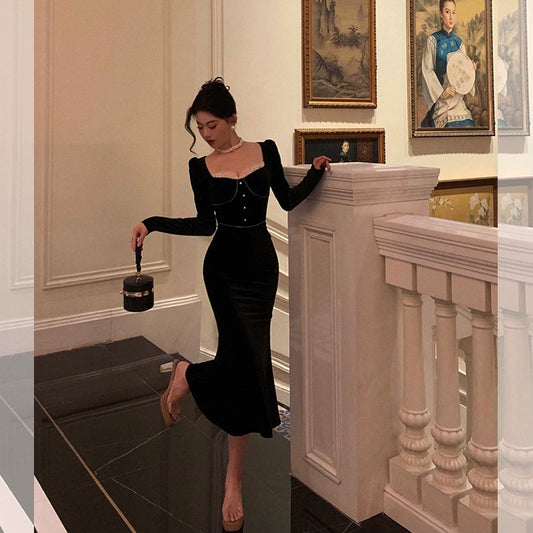 Retro velvet dress for women new style square neck mermaid party dress S5570