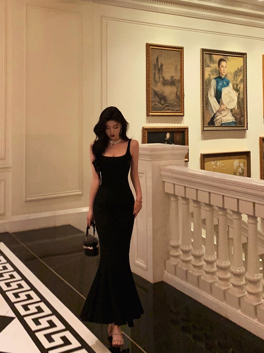 Black suspender mermaid dress summer new backless sexy long party dress S5574