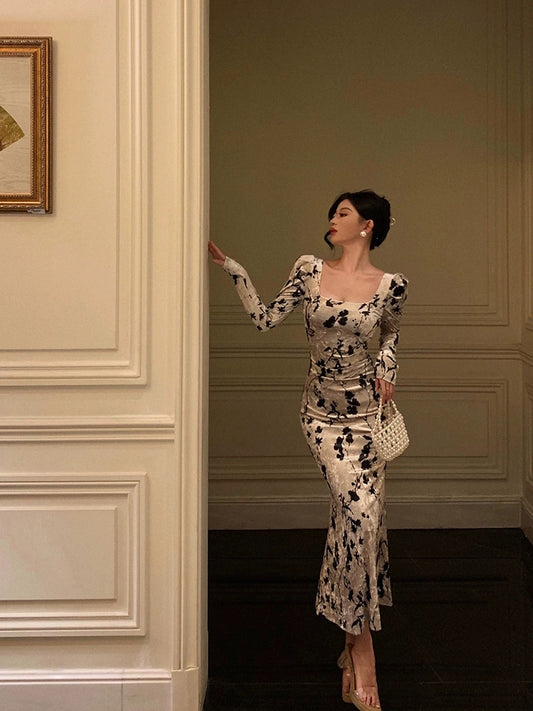 Rose print velvet dress for women new style square neck long dress S5488