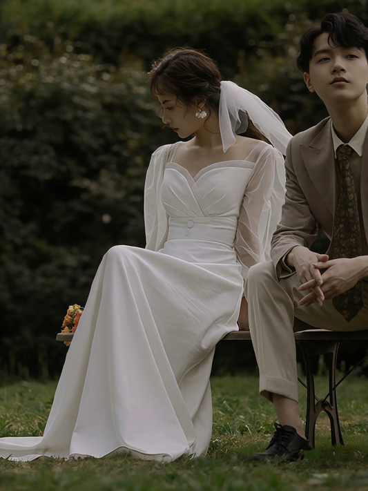 White With Small Train Satin Wedding Dress Sweet Lantern Sleeve Elegant A-line Gown S5437