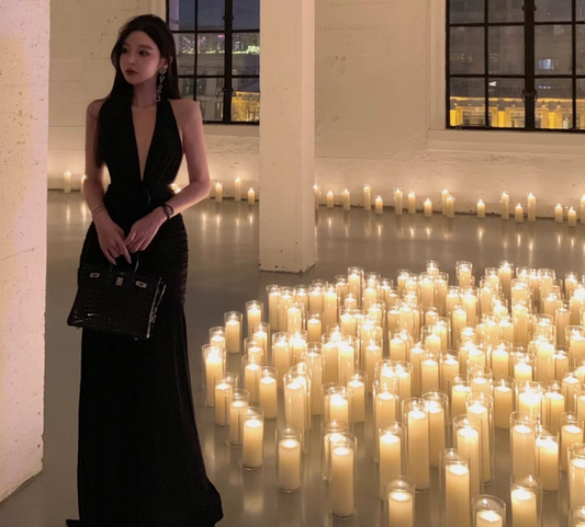 Black halter dress for women with deep V-neck evening dress, birthday dress S5442