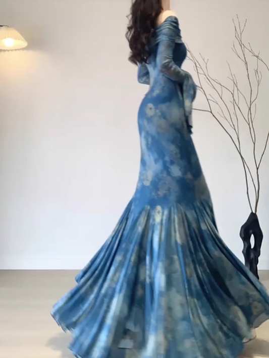 Mermaid Off The Shoulder Floral Blue Long Sleeves Party Dresses Birthday Outfits S5447