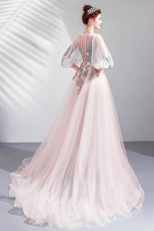 Light Pink Long Sleeves Tulle Prom Dress Princess Evening Gown with Lace S5145