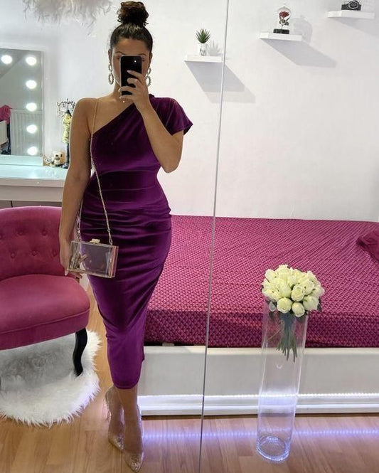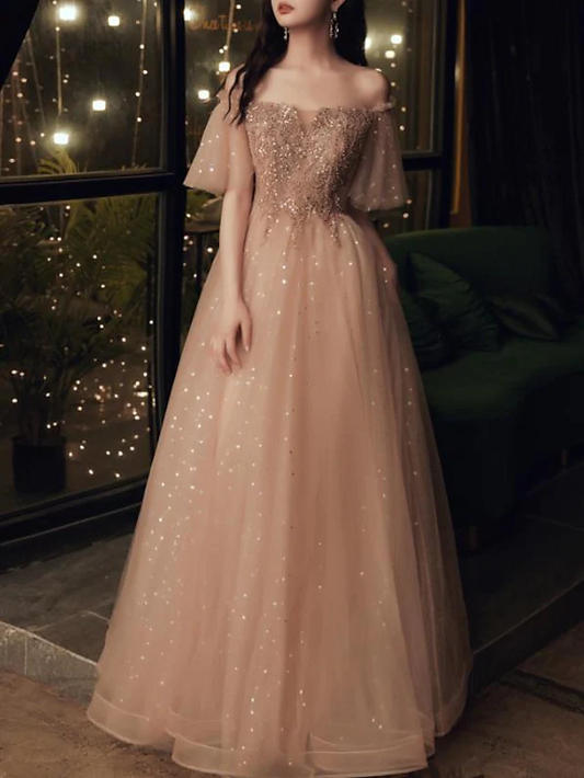 A-Line Glittering Elegant Wedding Guest Formal Evening Dress Scoop Neck Short Sleeve Floor Length Tulle with Pleats Sequin S1234