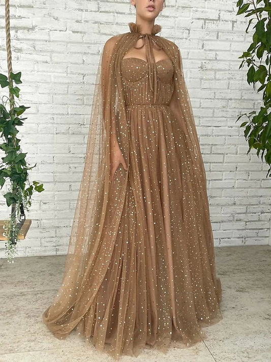 A-Line Evening Dresses Glittering Dress Engagement Floor Length Long Sleeve Scoop Neck Tulle with Sequin S1239