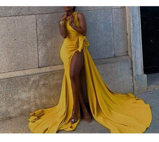 Long Yellow Prom dress with leg split, Evening dresses,wedding reception dress,african prom dress S927