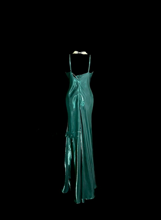 Green halter neck, fitted waist, revealing hips, sexy long ball gown R6659