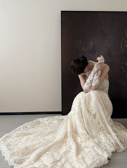White tube top lace waist slim fit temperament fishtail sexy long dress bridal gown R6060