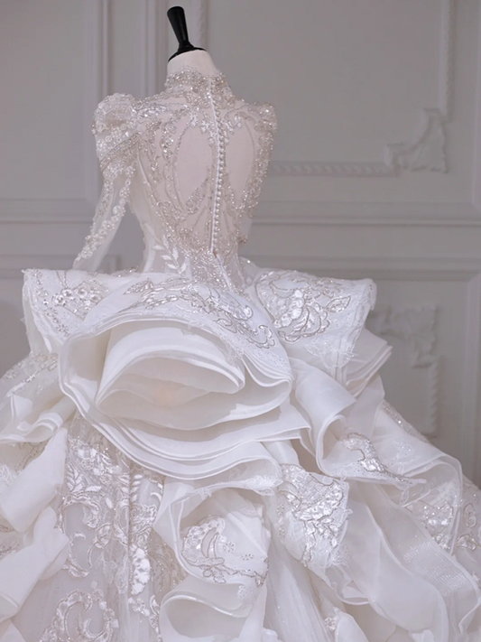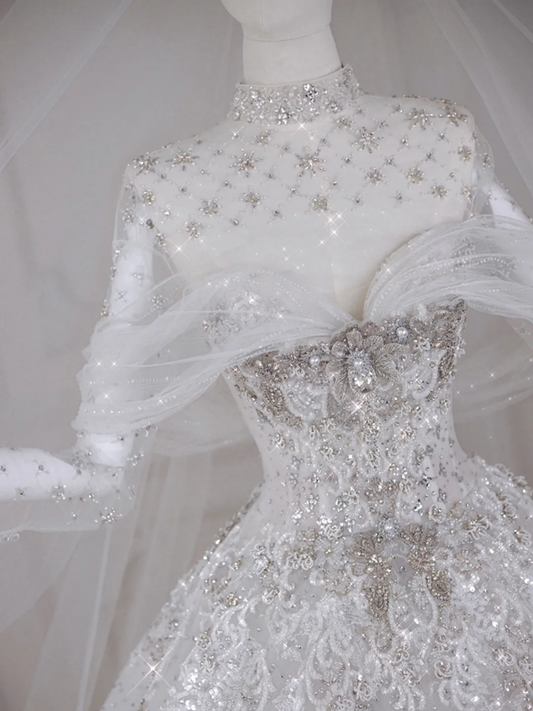 Elegant wedding dress with white bottom and bright diamonds, slim waist and puffy skirt R5868