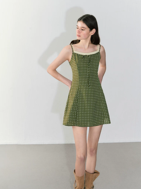 Olive Green Polka Dot Cami Mini Dress with Contrast Trim, Front Tie Detail and A-Line Silhouette R9244