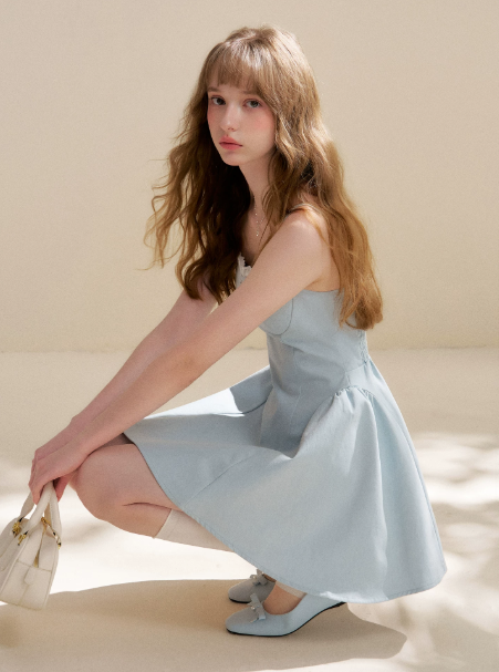 Baby Blue Spaghetti Strap Fit-and-Flare Dress with Bow Detail R9235