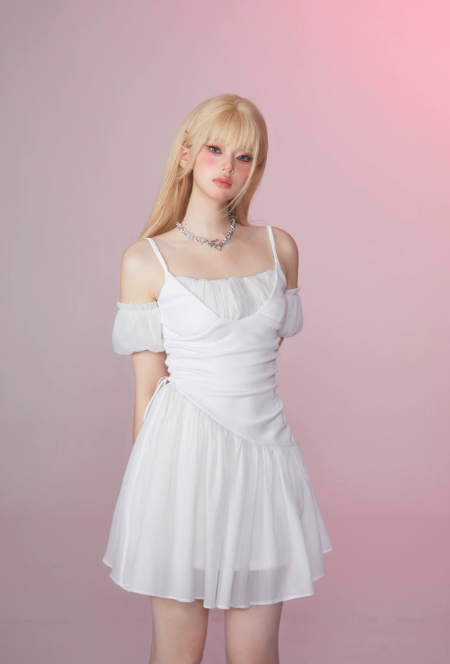 White Off-Shoulder Ruched A-Line Mini Dress with Back Bow R9238