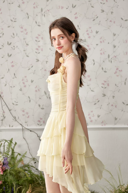 Soft Pale Yellow Halter Neck Chiffon Tiered Layered Mini Dress with Floral Applique and Asymmetrical Hem R9240