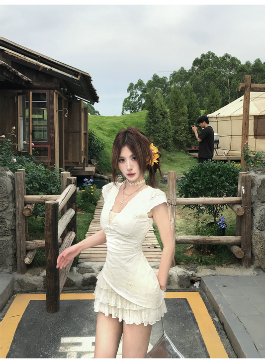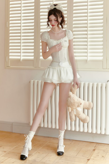Romantic White Lace-Trimmed Corset Set with Ruffled Puff Sleeves, Button Front and Floral Accent Skirt R9243