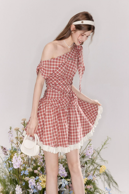 Cottagecore Gingham One-Shoulder Tie-Waist Mini Dress R9239