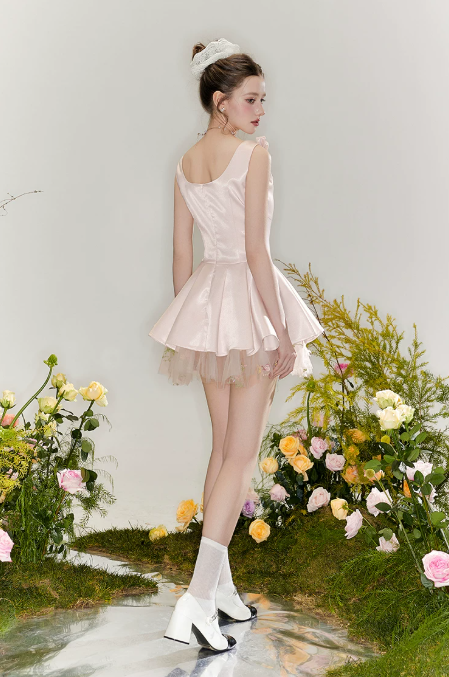 Blush Pink Satin Corset Mini Dress with Bow Detail, Ruffled Straps, Tulle Layered Skirt and Floral Embroidered Hem R9242