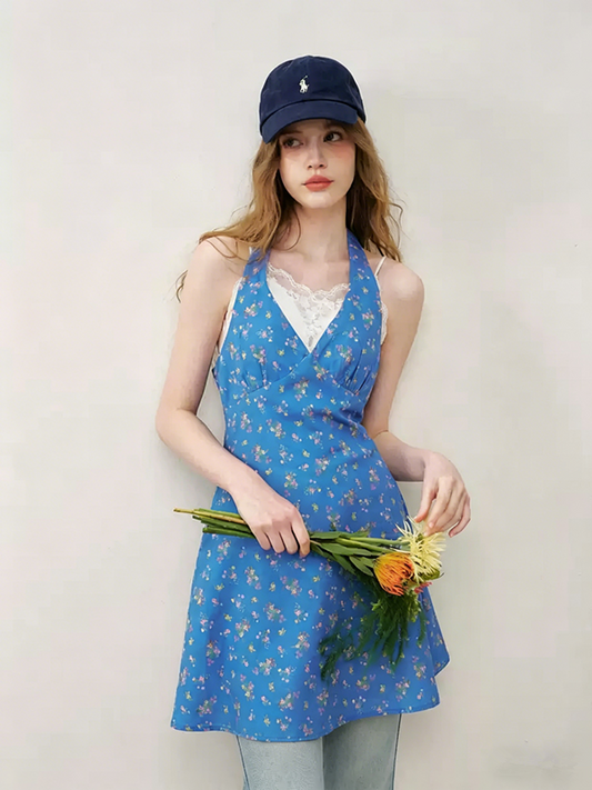 V-Neck Sleeveless Floral Print Summer Dress with Tie Back R9237