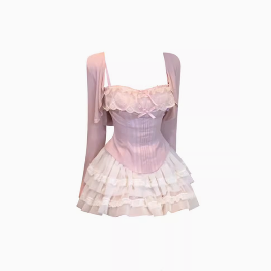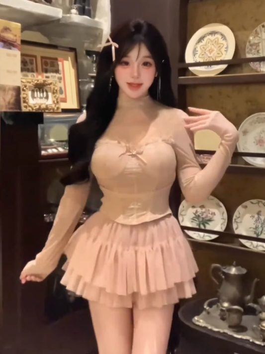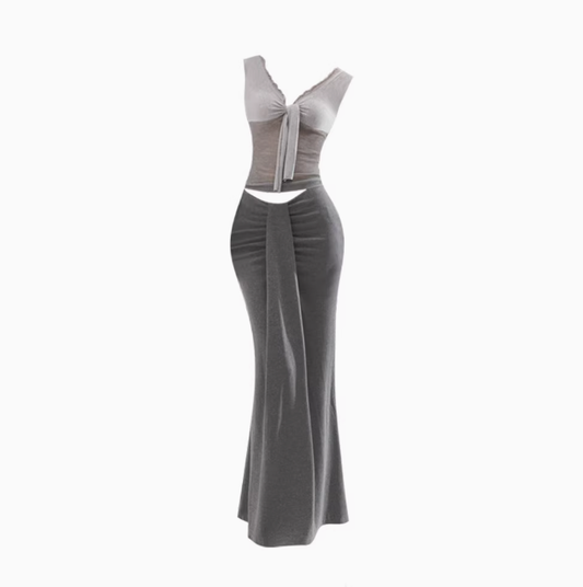 Fairy outfit two-piece suit design halter neck t-shirt fake two-piece plaid skirt suit R1699